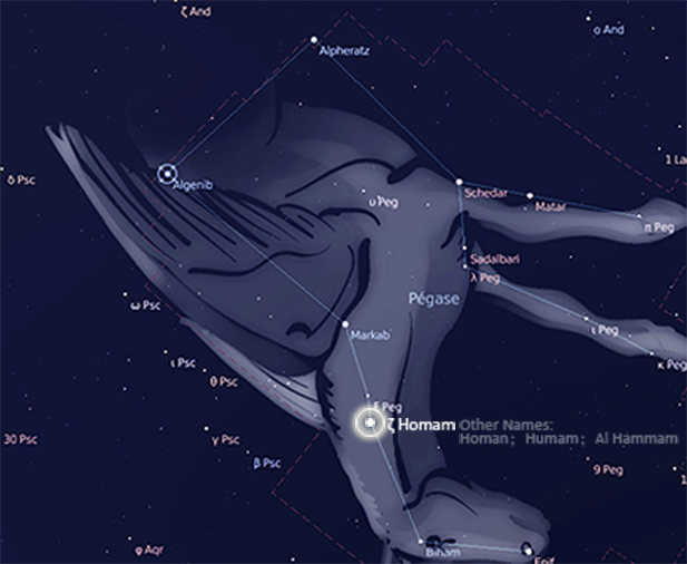 「Homam」這個單字在辭典裡並沒有任何解釋,其實 Homam 來自於飛馬座(Pegasus)的編號 ζ 星,中文名為雷電一,起源於阿拉伯語的「Lucky Star of High Minded 英雄的幸運星」語音相似,意指能夠駕馭神馬的人。
