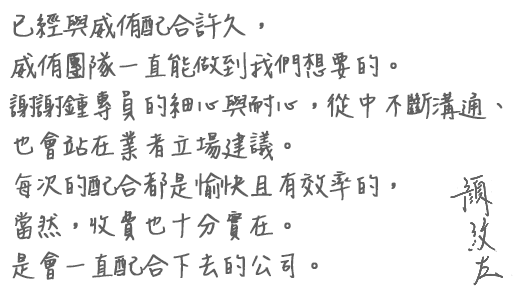 威侑網頁設計公司的核心理念是,設計需結合專業技術和活躍創意,以達到最佳效果。在每一個專案的製作過程中,我們的團隊都會堅持最高標準的流程控管,並且嚴格把關,確保設計品質符合客戶與設計師的期望。
